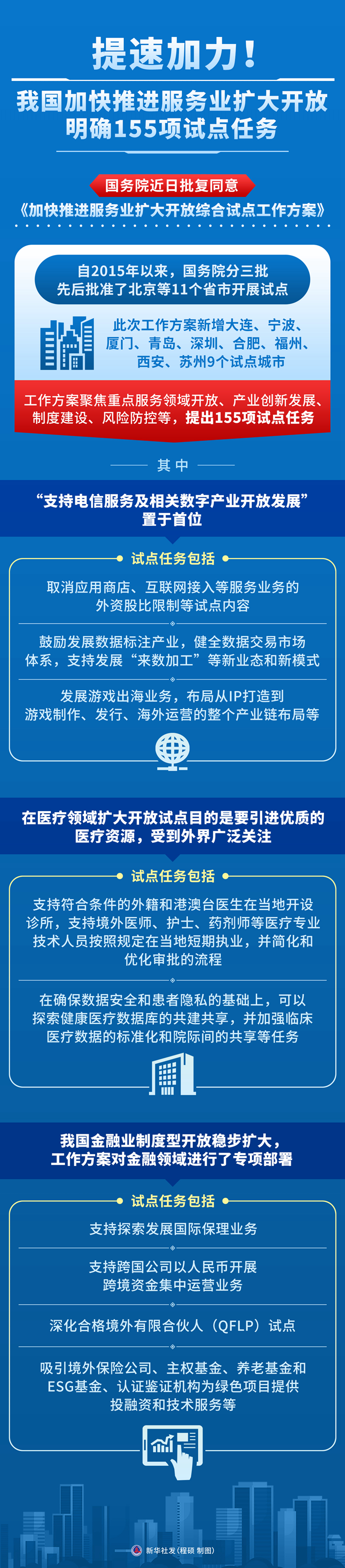 具體來看,工作方案聚焦重點服務(wù)領(lǐng)域開放、產(chǎn)業(yè)創(chuàng)新發(fā)展、制度建設(shè)、風險防控等,提出155項試點任務(wù)。