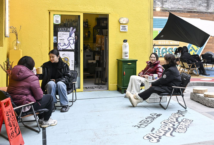 消費者在重慶市江北區(qū)大石壩街道忠恕沱社區(qū)一飲品店外休閑、聊天(2月24日攝)。新華社記者王全超攝