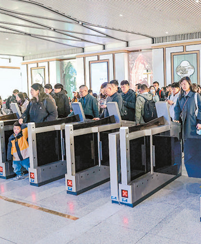近日,“水韻江蘇”主題旅游列車首發(fā),開(kāi)啟了春天環(huán)游江蘇的序幕。該旅游列車分A、B線,A線由南通站至上海虹橋站往返,B線由上海站至徐州東站往返。圖為在揚(yáng)州東站,游客檢票乘坐“水韻江蘇”旅游列車。任 飛攝(人民視覺(jué))