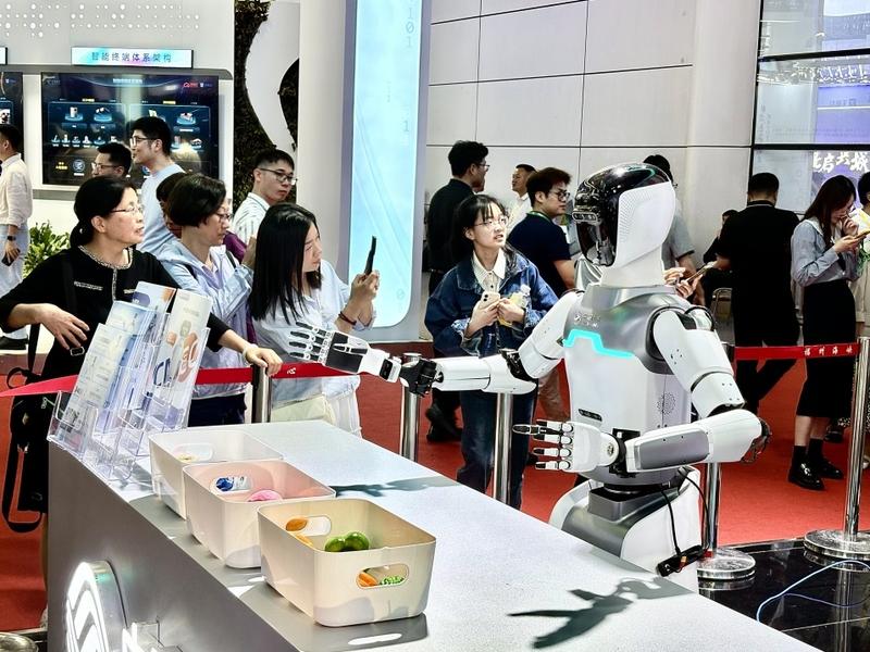 第八屆數(shù)字中國建設(shè)峰會(huì)現(xiàn)場(chǎng),游客駐足圍觀人形機(jī)器人。(鄭雅梅 攝)