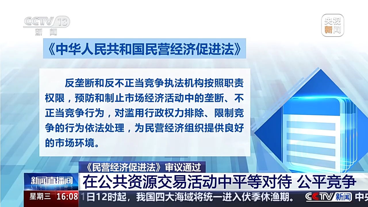 全國人大常委會法工委經(jīng)濟法室主任 楊合慶:規(guī)定市場準入負面清單以外的領(lǐng)域,包括民營經(jīng)濟組織在內(nèi)的各類經(jīng)濟組織可以依法平等進入;對落實公平競爭審查制度、定期清理市場準入壁壘、禁止在公共資源交易活動中限制或者排斥民營經(jīng)濟組織等作出規(guī)定。