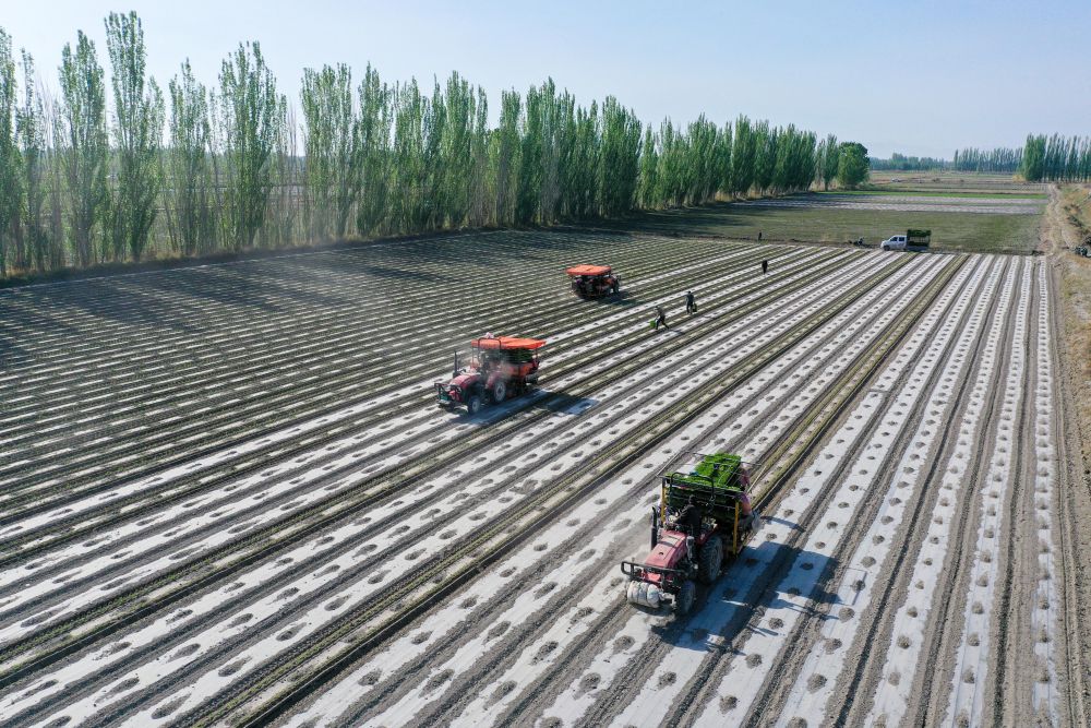 在新疆巴音郭楞蒙古自治州博湖縣本布圖鎮(zhèn),農(nóng)戶操作移栽機(jī)在農(nóng)田里移栽辣椒苗(4月28日攝,無(wú)人機(jī)照片)。新華社記者丁磊 攝