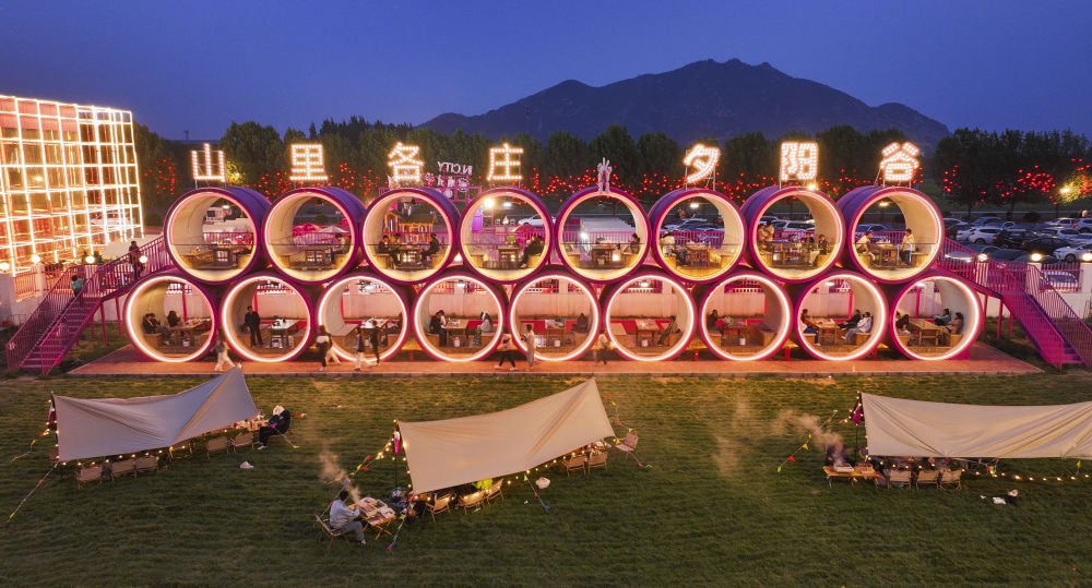 5月5日,游客在河北省遵化市夕陽谷景區(qū)游玩時品嘗美食(無人機照片)。