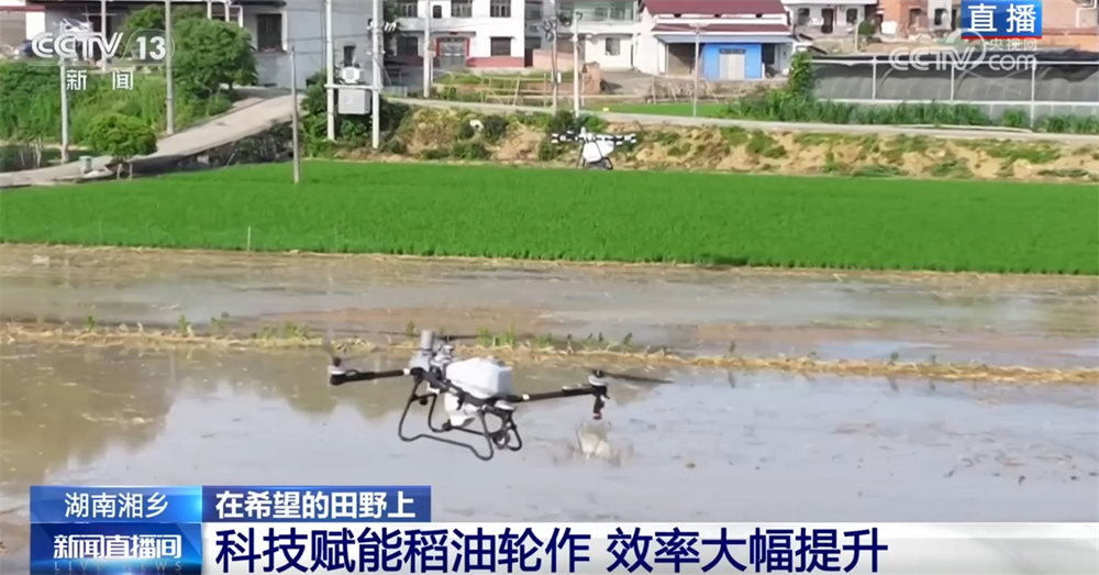 在這個(gè)階段,還有一件非常重要的工作就是施肥。眼下,施肥已經(jīng)很少依靠人工了。現(xiàn)場,大型的農(nóng)業(yè)無人機(jī)正在作業(yè),肥料均勻?yàn)⒃谔锢?。無人機(jī)還能做到自動(dòng)避障、自動(dòng)調(diào)節(jié)噴灑量,配備光譜儀還可以檢測莊稼的長勢,作業(yè)1畝地只需要不到20秒。