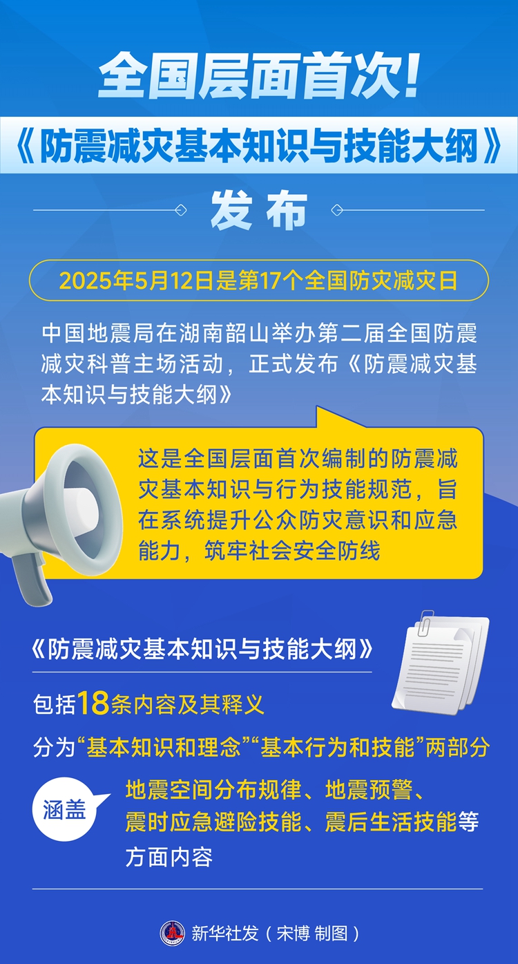 今年5月12日是第17個全國防災(zāi)減災(zāi)日。當(dāng)天,中國地震局在湖南韶山舉辦第二屆全國防震減災(zāi)科普主場活動,正式發(fā)布《防震減災(zāi)基本知識與技能大綱》,這是全國層面首次編制的防震減災(zāi)基本知識與行為技能規(guī)范,旨在系統(tǒng)提升公眾防災(zāi)意識和應(yīng)急能力,筑牢社會安全防線。