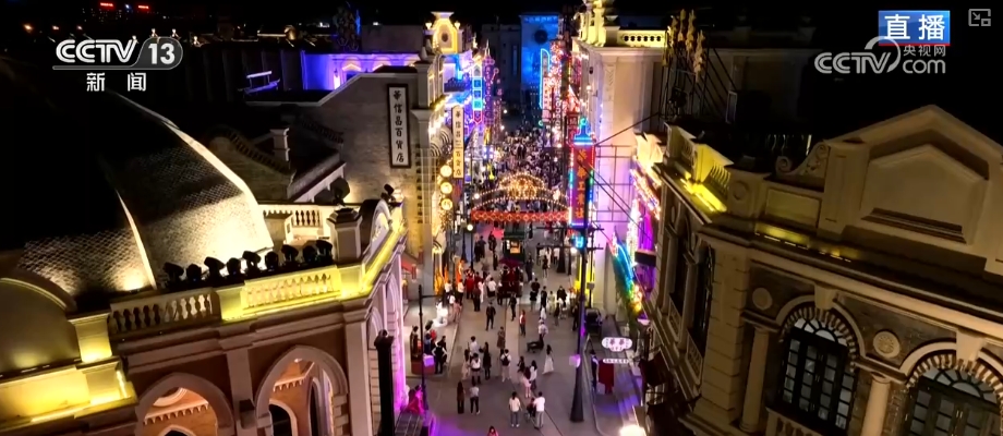 每到夜晚,“電影大道”街道兩旁霓虹燈裝點的老式招牌依次亮起,飯莊、百貨店、歌舞院,這些復古風格的店鋪還原出老電影里的場景。摩肩接踵的游客穿行其間,仿佛走入了百年前的“老鄭州”。