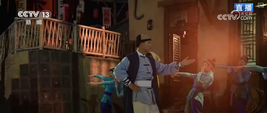 實際上,這處街道只是整場演出中的一幕。游客隨演員一路向前,長達1個小時的劇情講述了百年前一名外國導演來到鄭州,尋找太極的故事。其間,會串聯(lián)起景區(qū)的不同場景,比如走過繁華的“老鄭州”街道,后面就變成了一個古樸的村落。置景取材于太極拳發(fā)源地之一的河南焦作陳家溝,村里既有講述拜師學藝故事的情景劇,又有以太極功夫編排的舞蹈表演,體現(xiàn)出中原地區(qū)的多樣歷史文化。