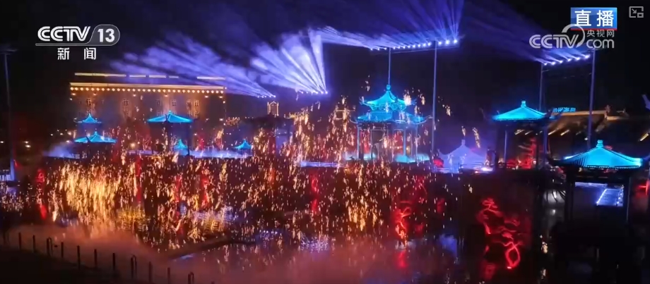 除了沉浸式演出,景區(qū)也在上新其他精彩節(jié)目。比如非遺打鐵花表演,比較常見的表演場景是在地面或者城樓之上。然而在這里,鐵花秀的表演場地選在了水面上的一處處亭臺樓閣中,火光四射,與樓閣呼應,映照出濃濃的中式美學。