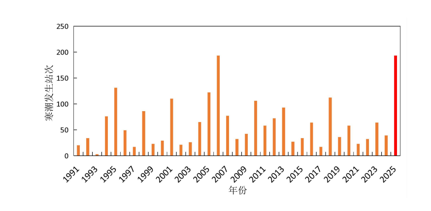 甘肅省氣象局統(tǒng)計的1991-2025年的3月1日至4月13日寒潮逐年變化柱狀圖。