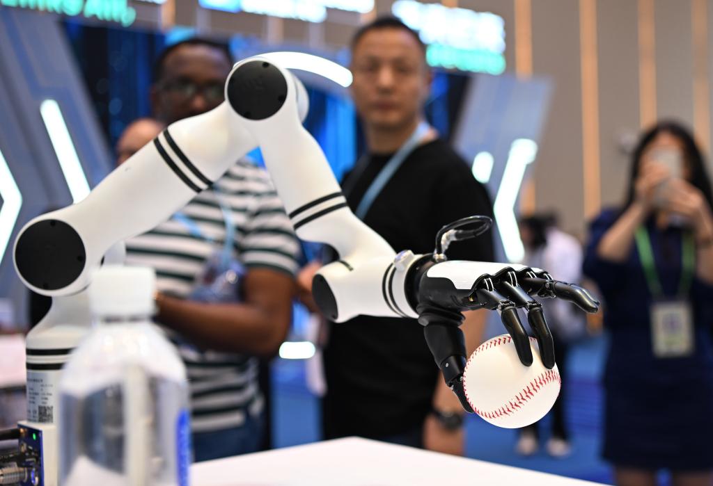 2025年4月15日,在第137屆廣交會(huì)服務(wù)機(jī)器人專(zhuān)區(qū),機(jī)械臂展示靈巧手功能。新華社記者 鄧華 攝