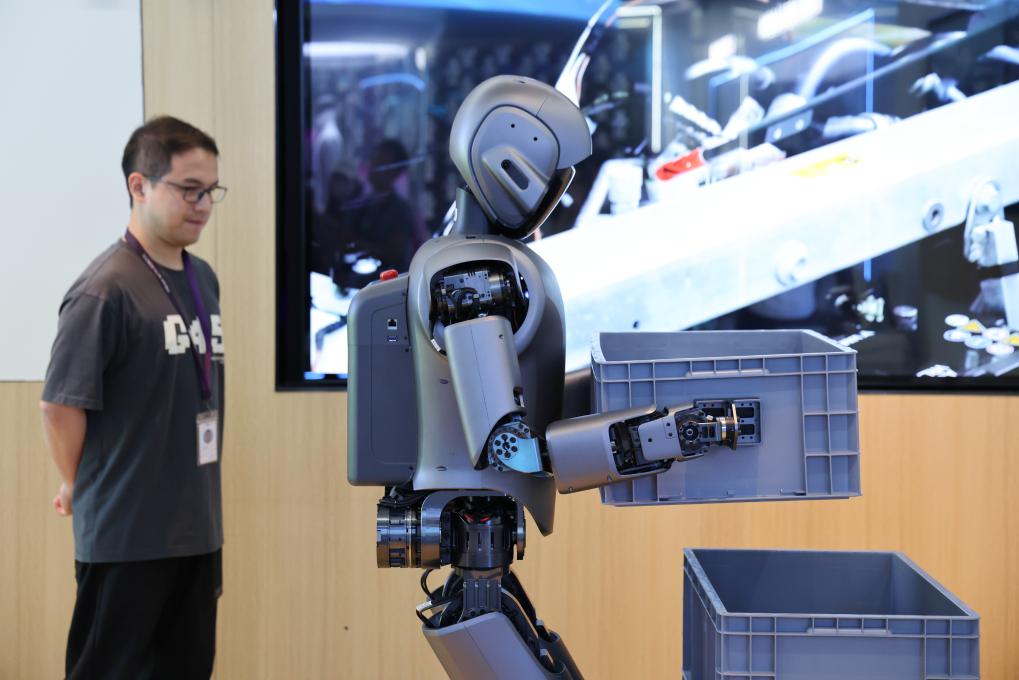 4月23日,在深圳優(yōu)必選科技展廳內(nèi),工業(yè)人形機(jī)器人Walker S演示搬運(yùn)物品。新華社記者 梁旭 攝