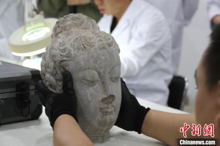 5月20日,河南洛陽,龍門石窟研究院工作人員展示已完成修復(fù)的唐代佛頭。 中新社記者 闞力 攝