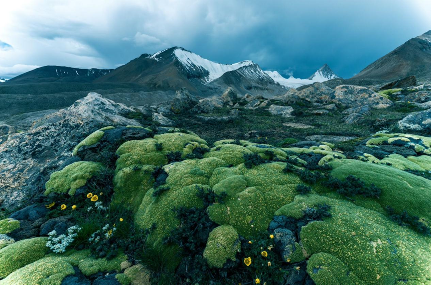 第二天一早,我們繼續(xù)向山脈的腹地去探索,前往冷布崗日腹地的道路也是無人踏足的,沒有正規(guī)車道的,所以我們同樣只能沿著牧民留下的車轍印前行。在一望無際的高原上,我們找不到路的時(shí)候就操縱無人機(jī)升空去探索路線。經(jīng)過了一整天的艱難探索,終于抵達(dá)了目的地,這個(gè)地方再往上走是完全沒有路了。在海拔約5800米左右的這個(gè)地方,不僅有巍峨壯美的雪山,還長(zhǎng)著很多這種獨(dú)特的高山苔蘚,這種植被通常只分布在海拔4000米以上的地區(qū),極具地域特色。所以在拍攝時(shí),我將這些高原特有的植被作為前景,既展現(xiàn)了高原生態(tài)風(fēng)貌,也作為海拔高度的天然標(biāo)識(shí),然后遠(yuǎn)處雄偉的冷布崗日雪山則構(gòu)成了畫面的核心部分。
