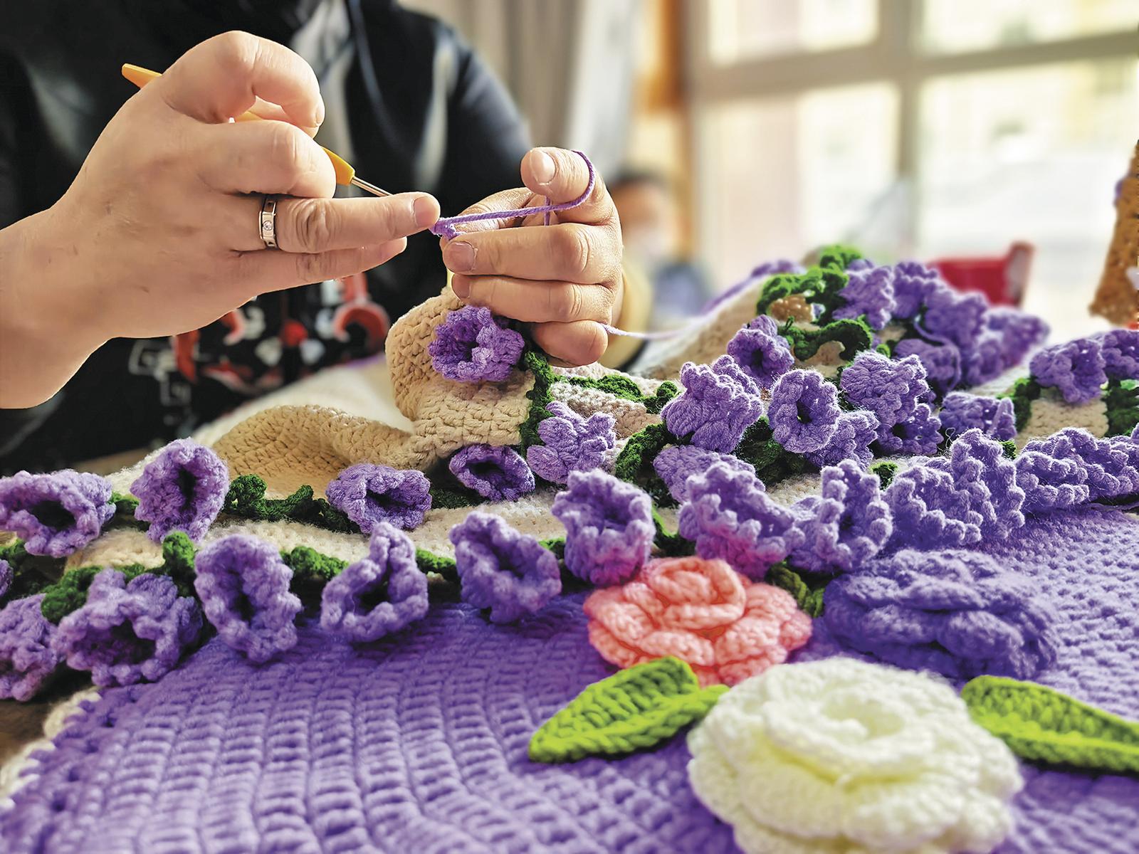 找到了目標就馬上行動,蓋毯、杯墊、發(fā)箍,玫瑰花、郁金香、鈴蘭花……各種花型的各類產(chǎn)品經(jīng)過她的一雙巧手被“創(chuàng)造”出來,成為工作室里最吸睛的“裝飾”,也吸引不少群眾前來“拜師學(xué)藝”。