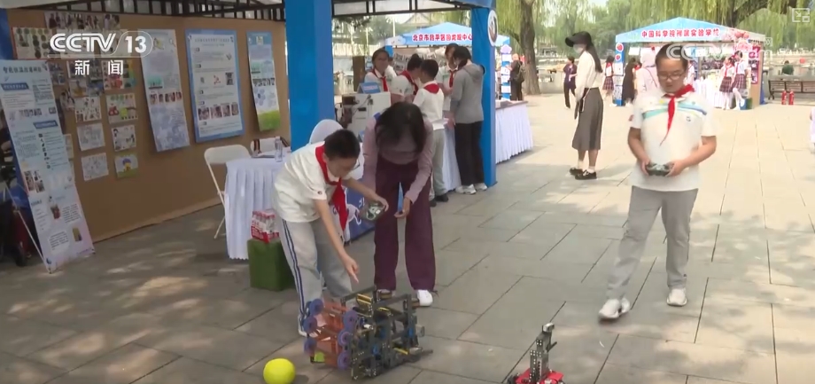 “科技強國”小學生社團風采展示活動也在現(xiàn)場同步開展。來自北京各個學校的少先隊科技社團齊聚一堂,孩子們興致盎然地分享自己設計拼裝的投球機器人、巡防機器人、智能消毒碗柜等精彩紛呈的科技成果。