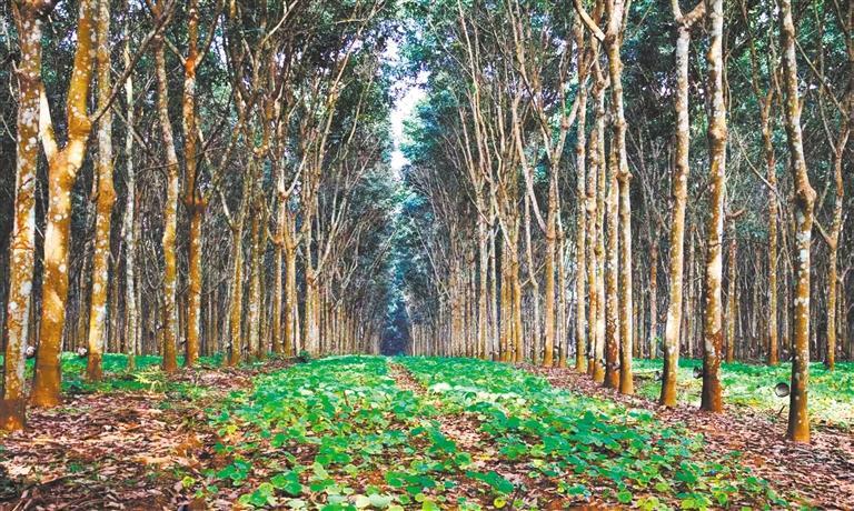 在距離西雙版納傣族自治州景洪市環(huán)城北路約1公里處,記者見到云南省熱帶作物科學(xué)研究所占地1054畝的環(huán)境友好型生態(tài)膠園千畝試驗(yàn)示范基地。這里將橡膠樹種植行距從傳統(tǒng)8米擴(kuò)大到20米以上,在橡膠樹間套種上述經(jīng)濟(jì)作物。如此布局,即使橡膠行情不好,經(jīng)過精心篩選套種的其他經(jīng)濟(jì)作物也能取得不錯的經(jīng)濟(jì)效益。