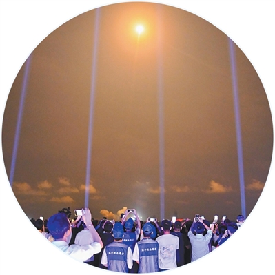 “5,4,3,2,1”——火箭的火焰照亮夜幕,平臺(tái)的光束射向天際……19時(shí)50分,火箭發(fā)射升空,游客們舉著手機(jī)記錄,現(xiàn)場(chǎng)歡呼聲陣陣?!昂芘d奮、很震撼,感覺(jué)一伸手就能‘抓’到火箭?!毖逾暦普f(shuō)。
