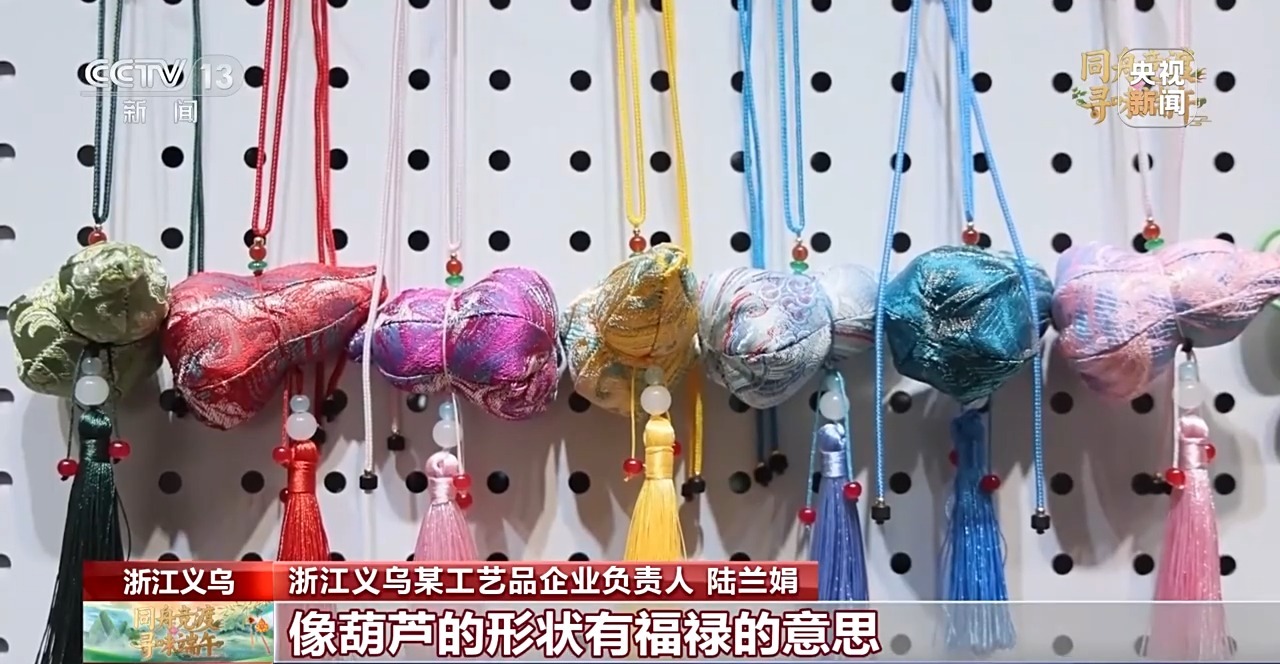 義烏某工藝品企業(yè)負(fù)責(zé)人 陸蘭娟:今年,在香囊的外觀設(shè)計(jì)上面,我們結(jié)合了中國(guó)傳統(tǒng)節(jié)日祝福的元素,設(shè)計(jì)了立體葫蘆、柿子等款式。像葫蘆的形狀有福祿的意思;柿子有事事如意的寓意,都是今年的“爆款”。