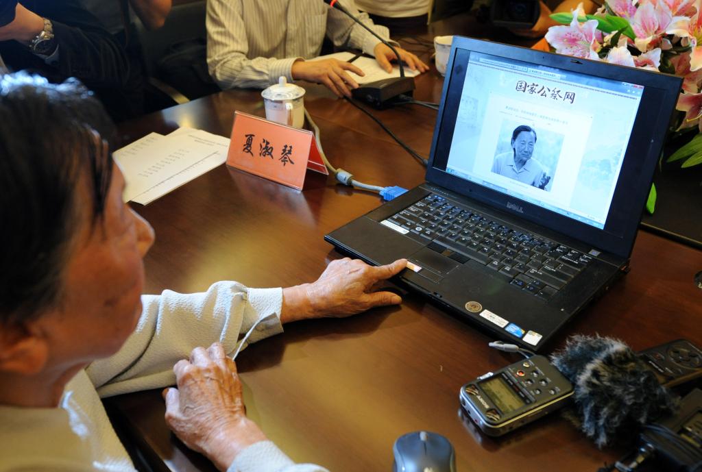 ↑2014年9月17日,夏淑琴點開自己口述證言公布網(wǎng)頁。從當(dāng)日起,侵華日軍南京大屠殺遇難同胞紀(jì)念館連續(xù)100天每天在國家公祭網(wǎng)和紀(jì)念館官方網(wǎng)站上公布一位南京大屠殺幸存者口述證言。新華社記者 孫參 攝