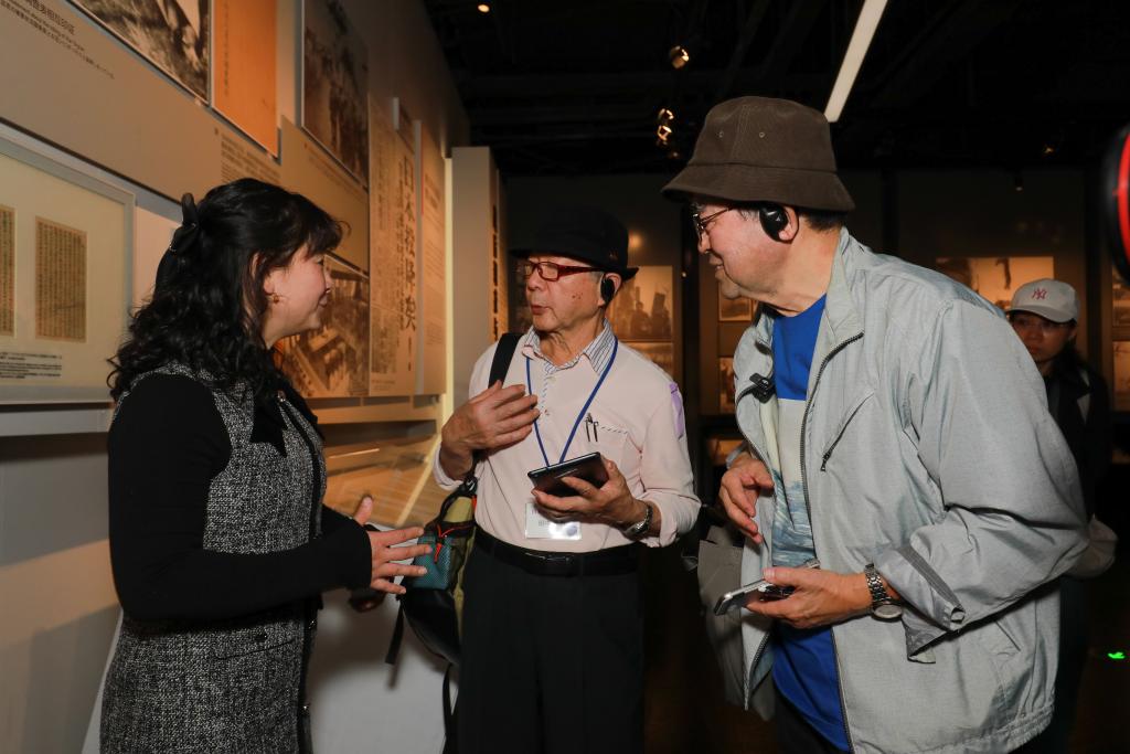 ↑2025年3月26日,夏淑琴的外孫女夏媛(左一)在侵華日軍南京大屠殺遇難同胞紀(jì)念館給日本“紫金草合唱團”成員講解。新華社發(fā)