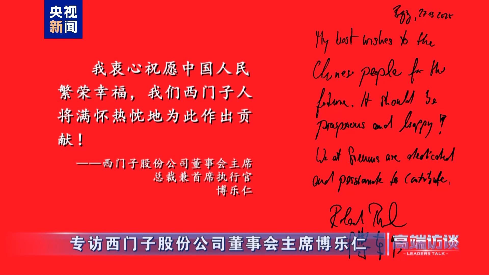 西門子股份公司董事會(huì)主席總裁兼首席執(zhí)行官博樂仁在接受總臺(tái)專訪后題詞
