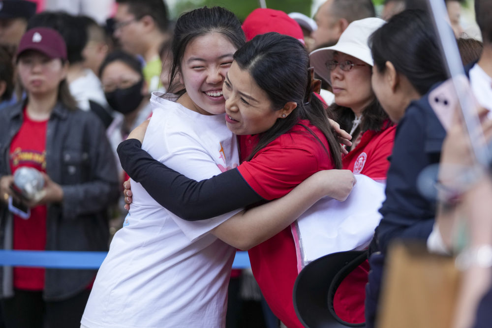 6月7日,在哈爾濱市第九中學(xué)考點(diǎn),考生走入考場(chǎng)前與老師擁抱。(新華社記者 王建威 攝)