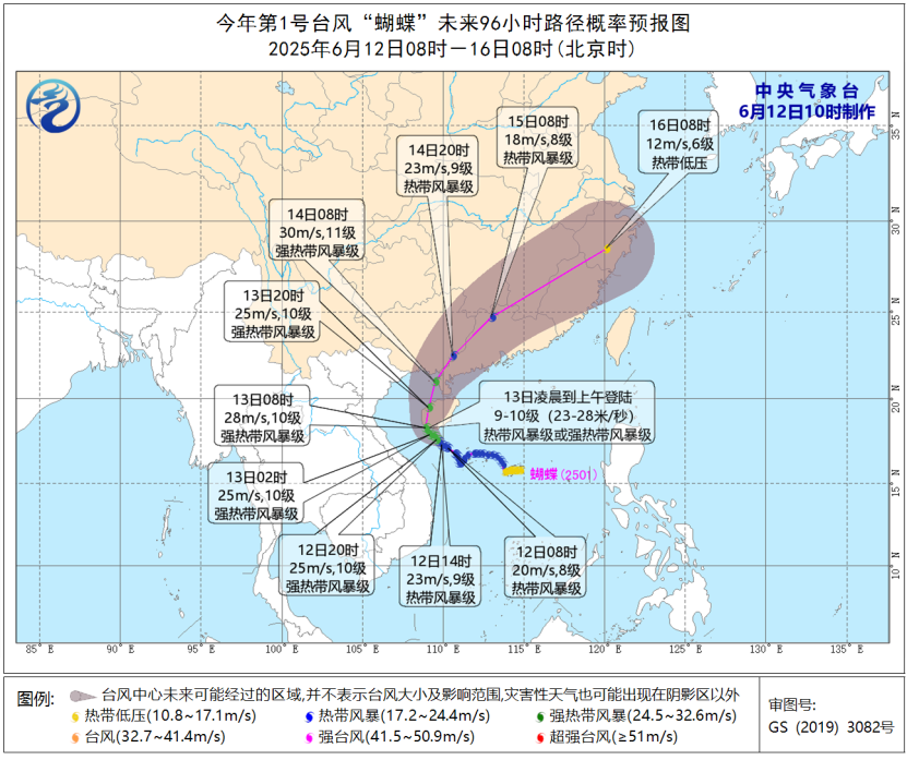 根據(jù)預(yù)報路徑,“蝴蝶”在海南島沿海首次登陸后,可能于14日白天在廣東西部到廣西沿海再次登陸,屆時強(qiáng)度仍將維持在強(qiáng)熱帶風(fēng)暴級,登陸后轉(zhuǎn)向東北方向移動,強(qiáng)度逐漸減弱。