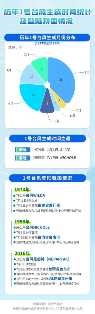 氣象上通常將當(dāng)年西北太平洋及南海生成的首個編號臺風(fēng)稱為“初臺”。統(tǒng)計顯示,每年1號臺風(fēng)生成的時間分散在1月至7月。1979年的“初臺”在元旦當(dāng)天就生成了,而1998年的“初臺”則直到7月9日才出現(xiàn)。常年平均“初臺”生成時間為3月25日,從這個角度看,今年第一個臺風(fēng)有點(diǎn)姍姍來遲了。