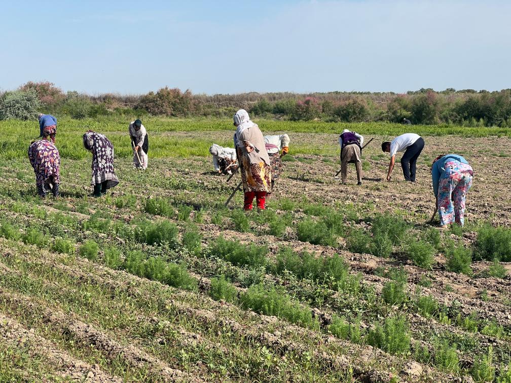 6月3日,位于烏茲別克斯坦穆伊納克鎮(zhèn)的咸海國際創(chuàng)新中心的試驗示范園區(qū)內(nèi),當(dāng)?shù)剞r(nóng)戶在與中國科學(xué)院新疆生態(tài)與地理研究所合作共建的“光伏+生態(tài)”鹽生植物園里勞作。(受訪者供圖)