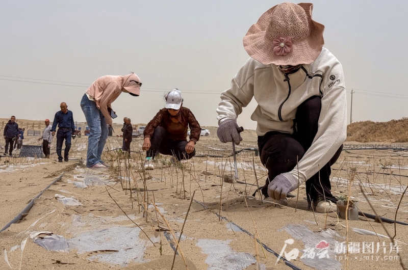 6月13日,在唐農(nóng)萬物(且末)生態(tài)科技有限公司實(shí)驗(yàn)示范基地,工人在補(bǔ)植蛋白桑。