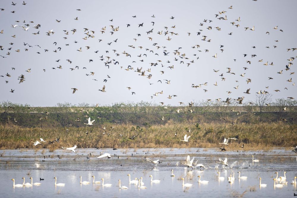 長江入???,上海崇明東灘候鳥棲息地淺灘與潮溝相間,水鳥悠然棲息于草叢之間。作為“中國黃(渤)海候鳥棲息地(第二期)”的遺產(chǎn)地之一,每年有大量鳥類在這里過境、停留。