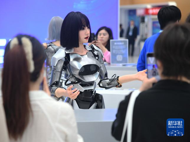 仿生人形機(jī)器人在2024中關(guān)村論壇年會會場設(shè)置的咨詢臺“迎賓”(2024年4月27日攝)。新華社記者 任超 攝