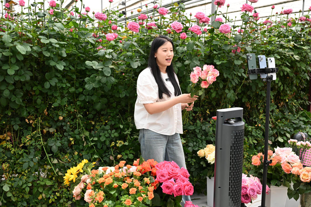 5月24日,在莒縣招賢鎮(zhèn)曲坊現(xiàn)代農業(yè)產業(yè)園的玫瑰基地,工作人員通過網(wǎng)絡直播銷售鮮切玫瑰花。新華社記者 馬寧 攝