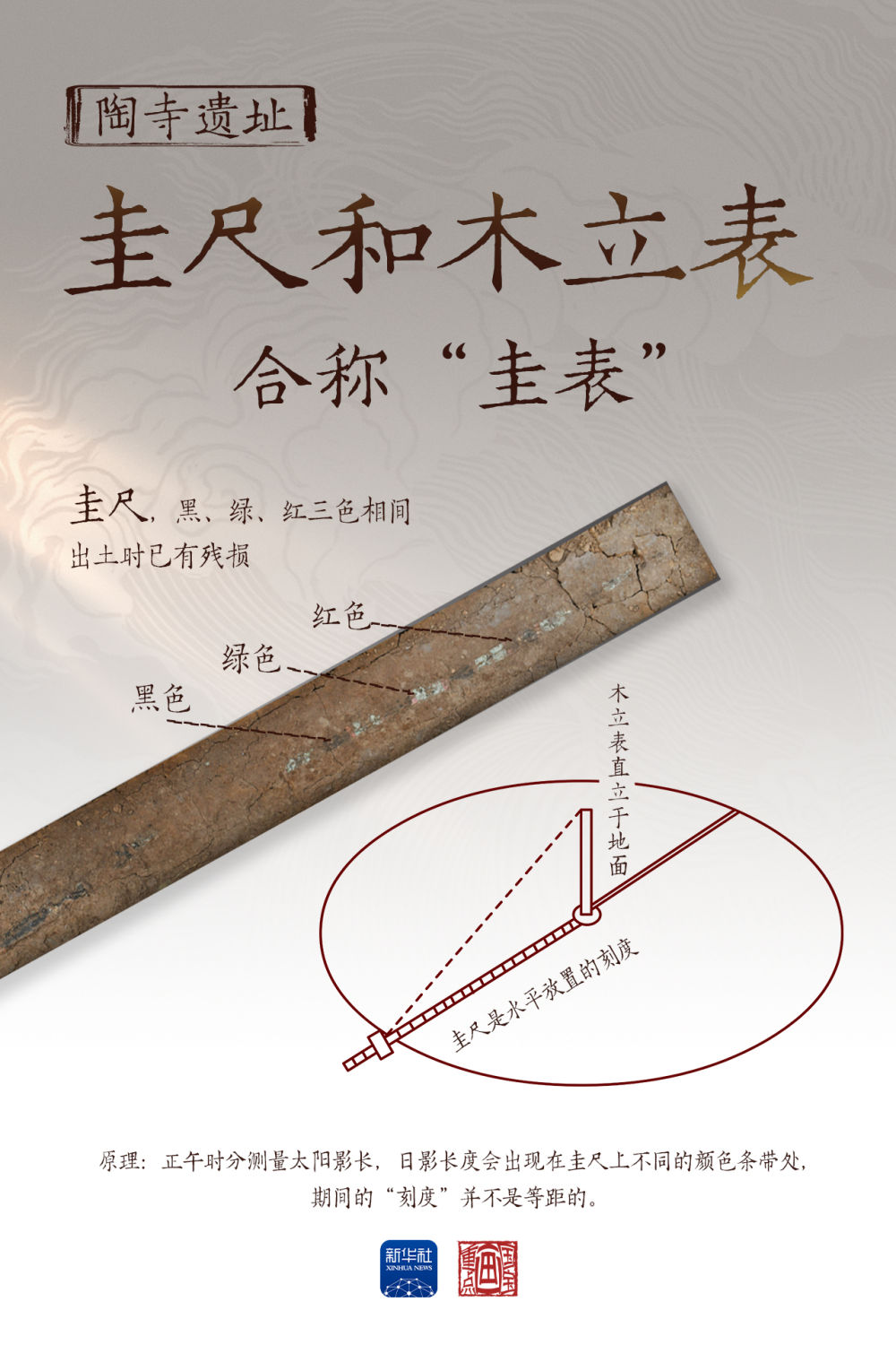 圭尺和木立表,是陶寺遺址出土的另外一件觀天象、授人時(shí)的文物,合稱“圭表”。木立表直立于地面,圭尺是水平放置的刻度。圭表測(cè)量太陽影長(zhǎng),與觀象臺(tái)相輔相成,用于太陽歷法的制定。黑、綠、紅三色相間的漆木桿“圭尺”,出土?xí)r已有殘損,殘長(zhǎng)171.8厘米,復(fù)原長(zhǎng)度187.5厘米。正午時(shí)刻,太陽照在木立表上,投下的影子被圭尺上的刻度標(biāo)記出長(zhǎng)短。在夏至、春分和秋分,日影長(zhǎng)度會(huì)出現(xiàn)在圭尺上不同的顏色條帶處,期間的“刻度”并不是等距的。