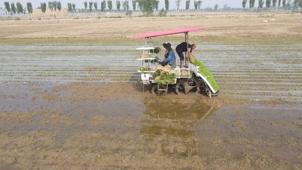 在河南省新鄉(xiāng)市原陽縣太平鎮(zhèn),種植戶們在插秧機(jī)的助力下,搶抓農(nóng)時,進(jìn)行水稻插秧。受訪者供圖