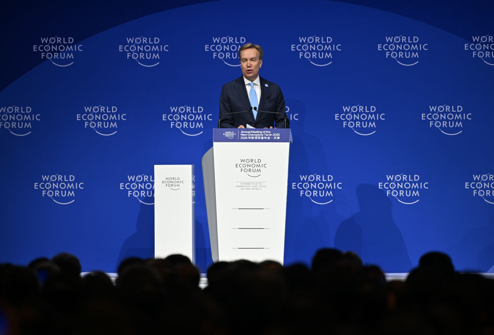 6月25日,在國(guó)家會(huì)展中心(天津),世界經(jīng)濟(jì)論壇總裁博爾格·布倫德在開幕式上發(fā)言。新華社記者 孫凡越 攝