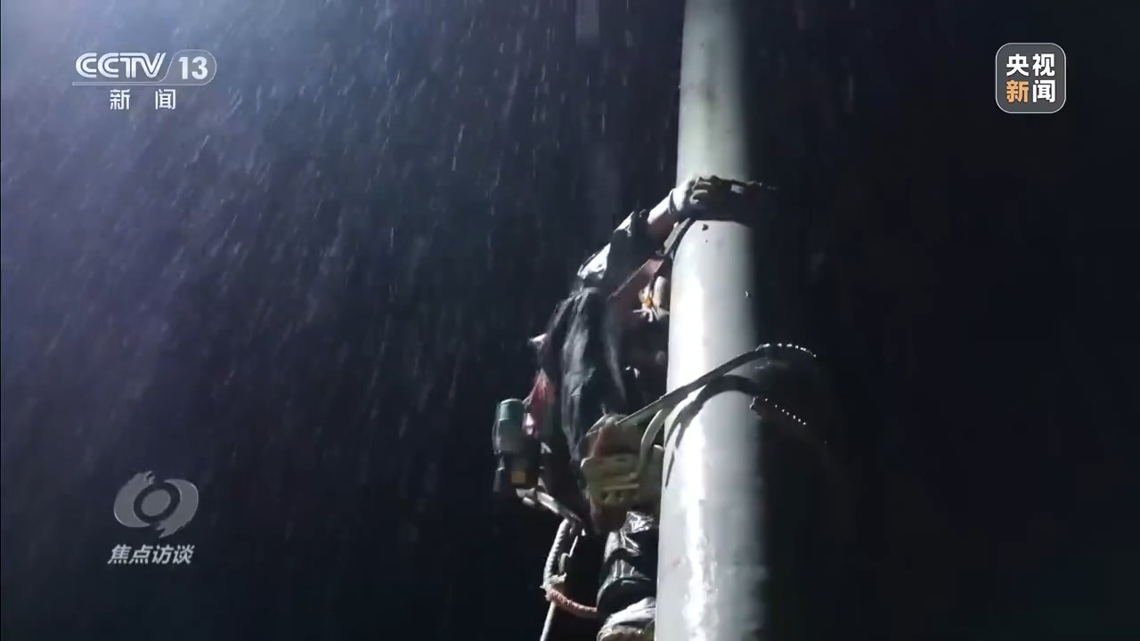 運(yùn)線、接線、試驗(yàn)……雨夜中,隊員們分工協(xié)作,借助車燈和探照燈的光亮,將一根1100米長、近4噸重的電纜拉過大橋,沿著公路邊緣一路拉到變壓器旁。大雨中作業(yè),雨水很快就打濕了他們的衣服。為了搶修進(jìn)度,高空作業(yè)人員在電桿上一待就是好幾個小時。