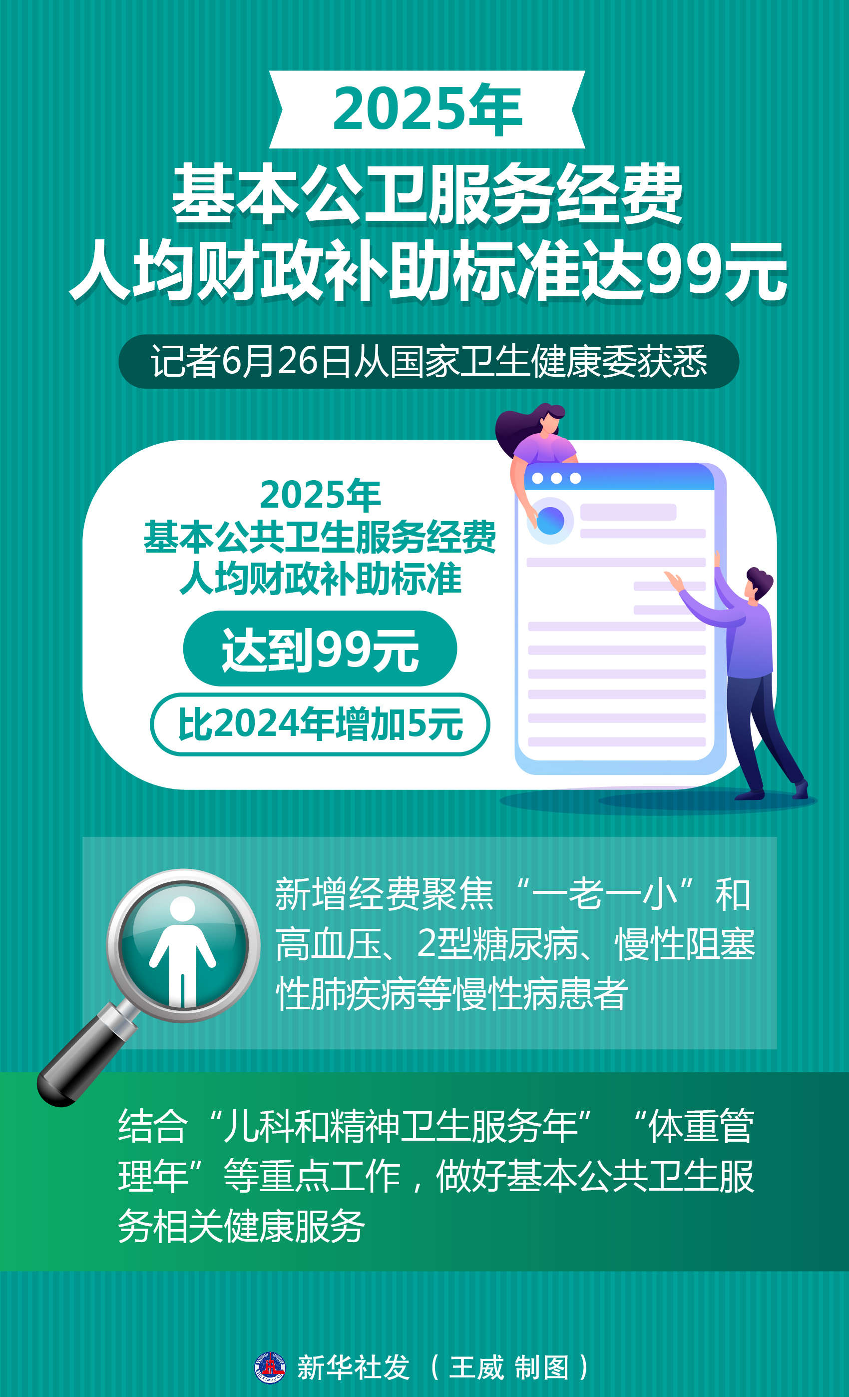 記者26日從國家衛(wèi)生健康委獲悉,2025年基本公共衛(wèi)生服務經(jīng)費人均財政補助標準達到99元,比上年增加5元。