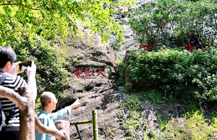 6月25日,游客在福建武夷山風(fēng)景名勝區(qū)參觀生長(zhǎng)在武夷山九龍窠高巖峭壁上的大紅袍茶樹母株。
