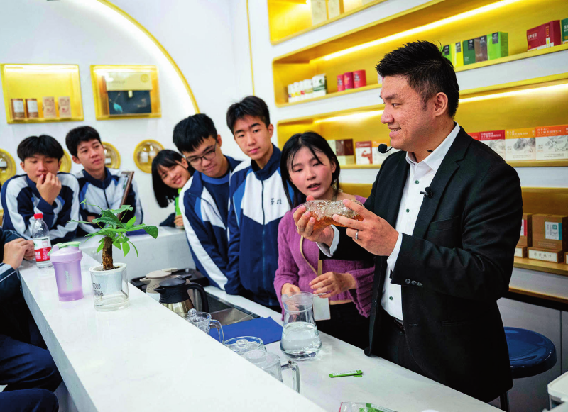 澳門居民黃滋才(右一)在位于橫琴的分子態(tài)(珠海橫琴)中醫(yī)藥健康產(chǎn)業(yè)發(fā)展有限公司的植物(現(xiàn)代中藥)分子博物館內(nèi)與澳門勞校中學(xué)的學(xué)生交流(2024年12月11日攝)新華社發(fā)(張金加攝)