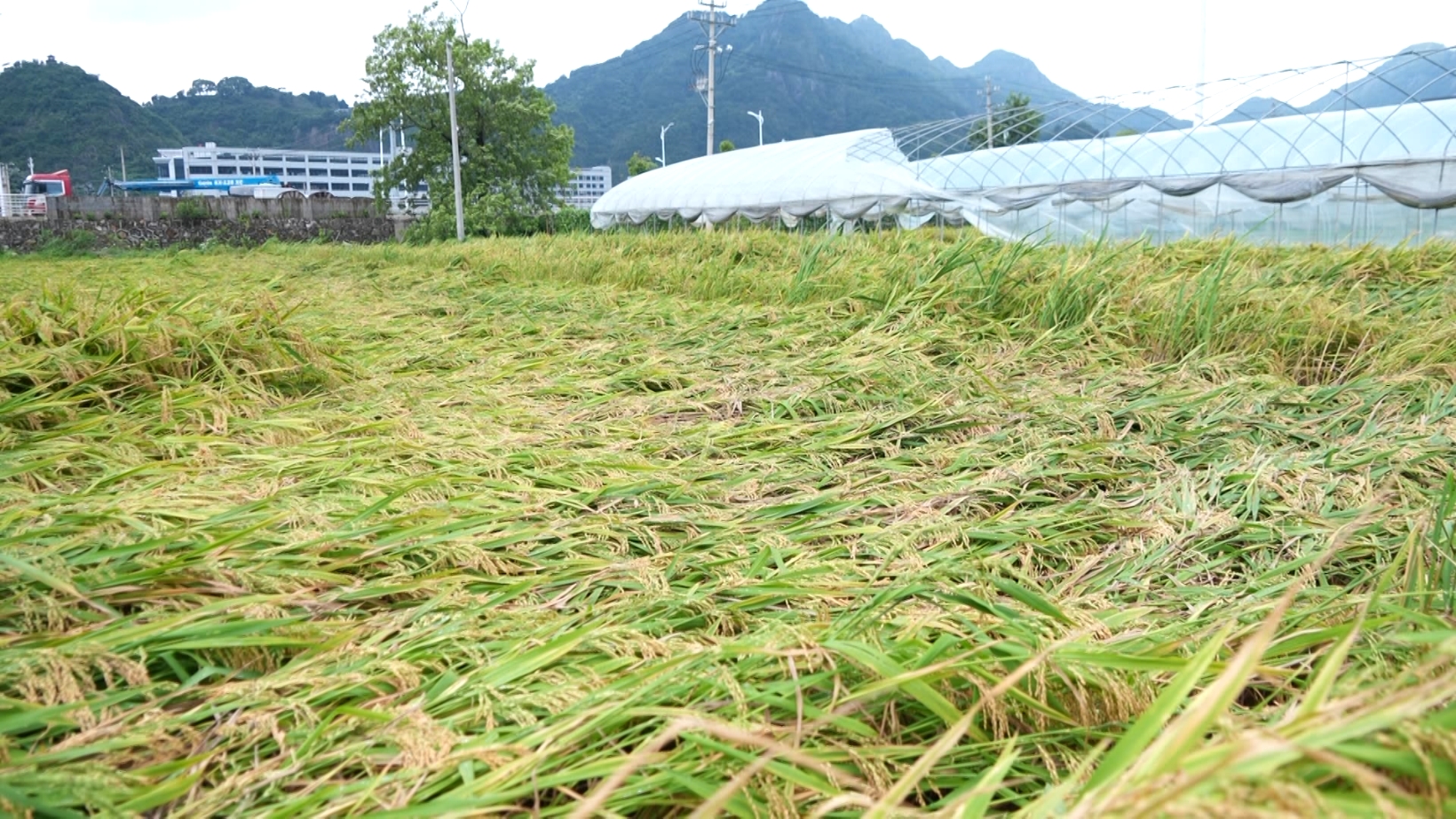 現(xiàn)場,大棚倒塌、薄膜被吹翻,成片的成熟早稻貼伏在地面。種植戶周永乾踩著泥濘,忙不迭給稻田排水,滿臉焦急?!敖衲觊L勢比前幾年都好,平均畝產(chǎn)一千斤以上,開始都高興的很,沒想到快收割的時候刮臺風(fēng)。我們一夜都沒睡,在家里睡不著,現(xiàn)在只剩下山邊的四十來畝稻子,其他的都倒平了?!?/p>