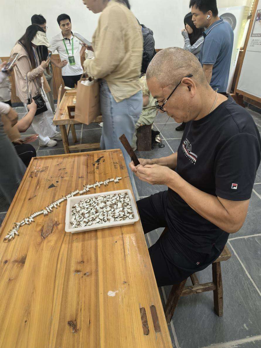 在博物館的體驗(yàn)區(qū)域,幾位制筆匠人正現(xiàn)場(chǎng)演示毛筆制作的各工藝環(huán)節(jié)。市級(jí)非物質(zhì)文化遺產(chǎn)項(xiàng)目代表性傳承人周平正咬著線的一端,兩手飛快地纏綁筆頭,這是制筆過程的“綁筆”環(huán)節(jié)。周平的徒弟李啟富在一旁認(rèn)真觀看,將師父的每一個(gè)動(dòng)作記在心里。