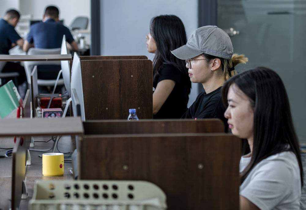 來(lái)自華僑大學(xué)的臺(tái)灣學(xué)生(右二)在廈門“臺(tái)青創(chuàng)客家”里實(shí)習(xí)(2024年6月14日攝)。新華社記者 魏培全 攝