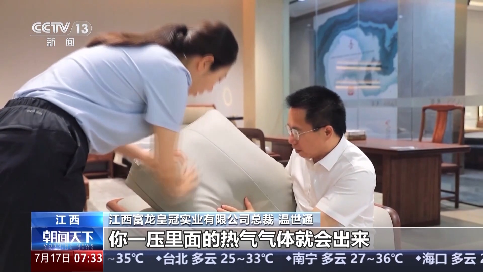 江西富龍皇冠實業(yè)有限公司總裁 溫世通:沙發(fā)靠墊后面我們全部打了透氣孔,一壓里面的熱氣氣體就會出來,保證背部不會有很熱很燙的感覺,在銷售方面保持增長。