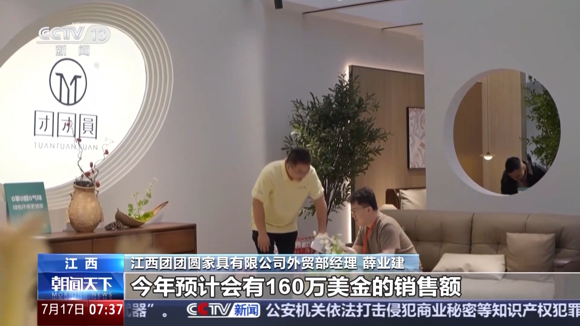 江西團團圓家具有限公司外貿部經理 薛業(yè)建:家具在7月到11月是一個銷售旺季,今年預計會有160萬美元的銷售額。