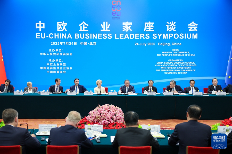 國務(wù)院總理李強(qiáng)7月24日下午在北京人民大會堂同歐盟委員會主席馮德萊恩共同出席中歐企業(yè)家座談會。近60位中歐商會和企業(yè)負(fù)責(zé)人出席。