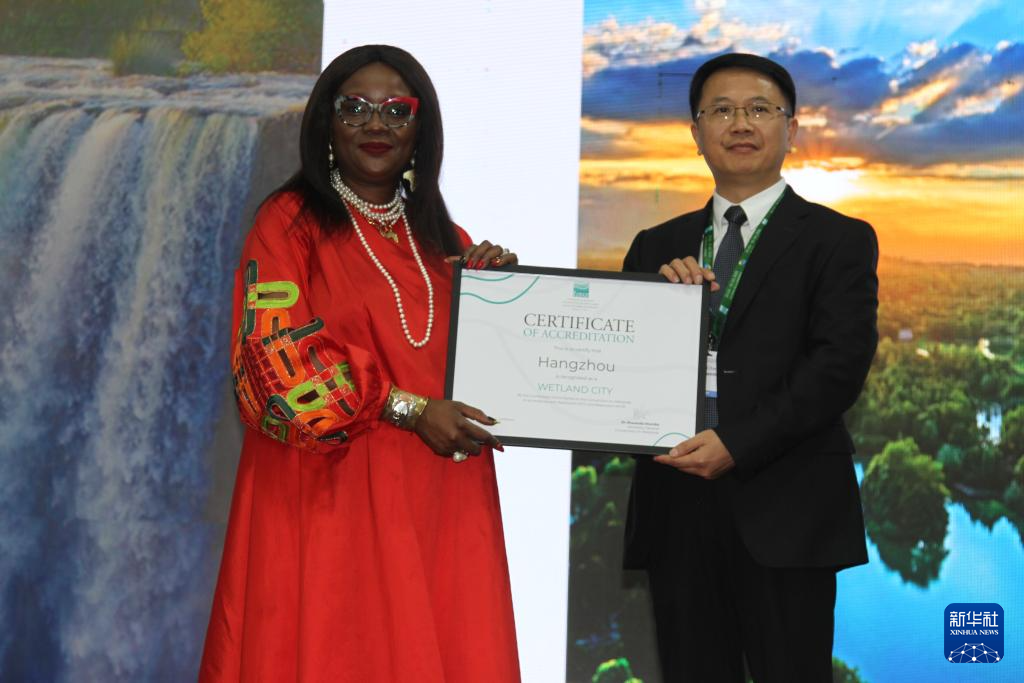 7月24日,在津巴布韋維多利亞瀑布城開幕的《濕地公約》第十五屆締約方大會上,《濕地公約》秘書長穆松達(dá)·蒙巴為中國浙江杭州代表頒發(fā)“國際濕地城市”證書。新華社發(fā)(塔法拉攝)