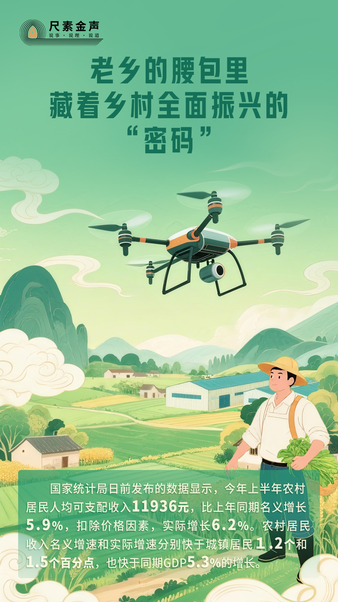 國家統(tǒng)計局日前發(fā)布的數(shù)據(jù)顯示,今年上半年農(nóng)村居民人均可支配收入11936元,比上年同期名義增長5.9%,扣除價格因素,實際增長6.2%。農(nóng)村居民收入名義增速和實際增速分別快于城鎮(zhèn)居民1.2個和1.5個百分點,也快于同期GDP5.3%的增長。