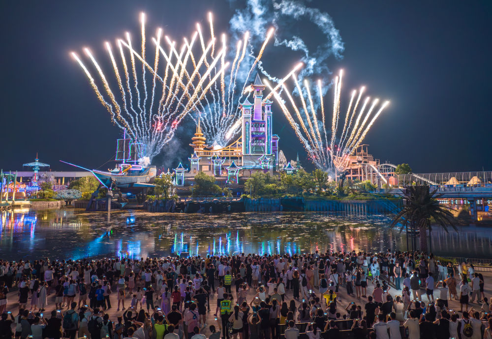 7月19日,在湖北省襄陽市華僑城奇幻谷,游客觀看大型夜間演藝秀《奇幻城堡光影秀》(無人機照片)。新華社發(fā)(楊東 攝)