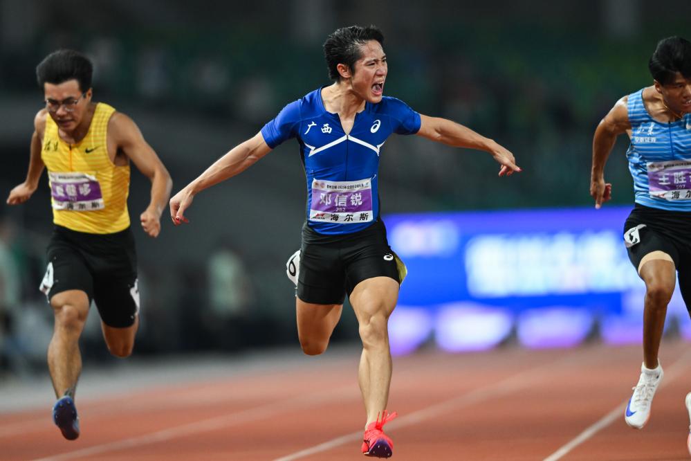男子100米半決賽也進(jìn)行得異常激烈,名將謝震業(yè)因?yàn)樵谛〗M中排名第四,甚至沒能闖入決賽。兩小時(shí)之后的決賽中,半決賽排名第一的廣西隊(duì)選手鄧信銳以10秒06的個(gè)人最好成績奪冠,成為史上第七位突破10秒10的中國隊(duì)運(yùn)動(dòng)員。